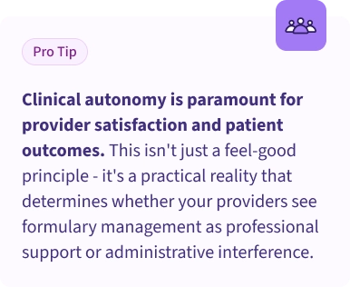 Clinical autonomy is paramount for provider satisfaction and patient outcomes. This isn't just a feel-good principle - it's a practical reality that determines whether your providers see formulary management as professional support or administrative interference.