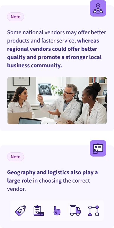 You must also compare national and regional distributors. Some national vendors may offer better products and faster service, whereas regional vendors could offer better quality and promote a stronger local business community.